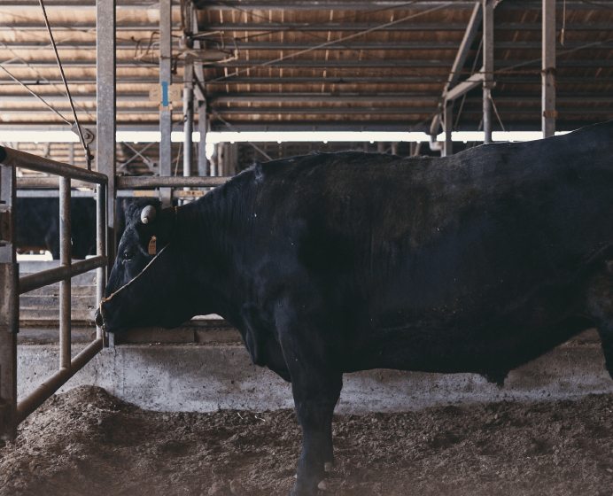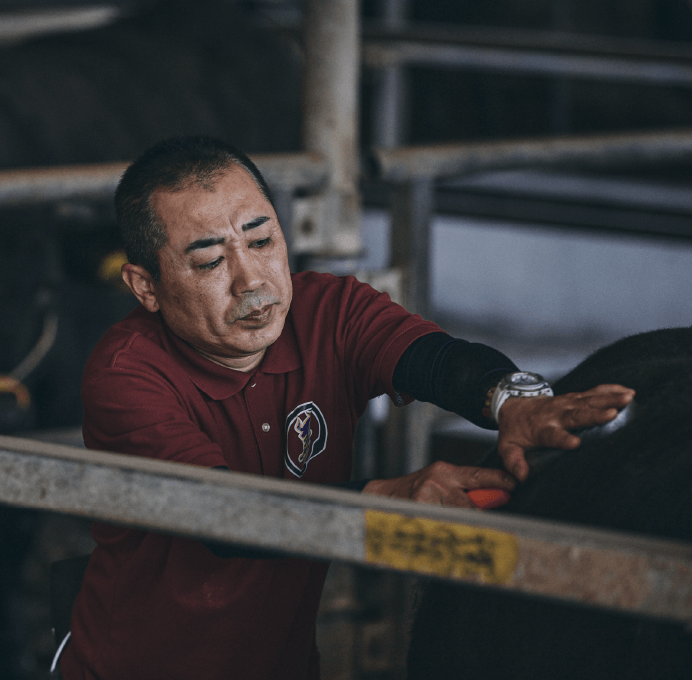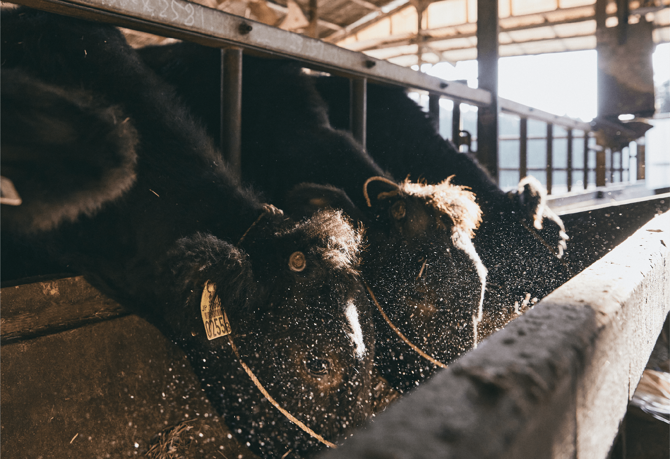 師匠とともに配合を磨いてきました。餌は常にオリジナルの配合を模索しています。時代によって入手できる飼料も変わるため、師匠と連絡を取り合い、試行錯誤してきました。成長期によって餌の内容は異なり、与える量もグラム単位で調整しています。餌代には充分なコストをかけ、体格がよく、味もいい牛さんを造ります。横から見ると背中のラインが水平で、前から見ると肩が張り力強い。どこから見ても四角四面に見え、艶がある。そんな美しさと力強さを兼ね備えた牛さんを理想としています。