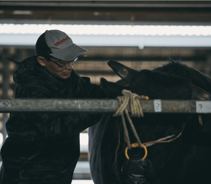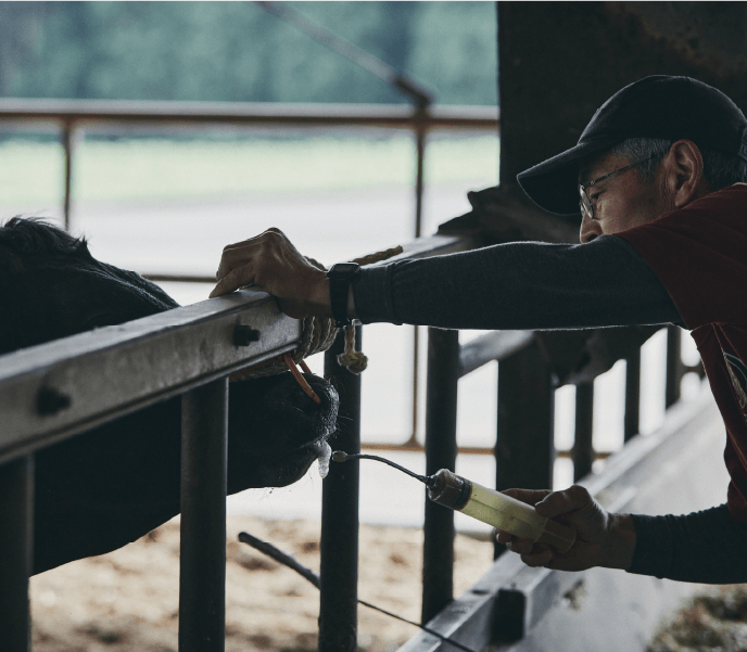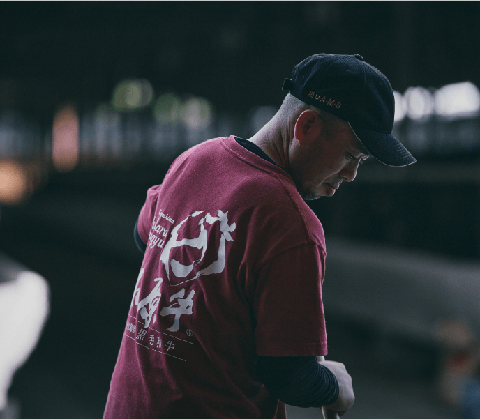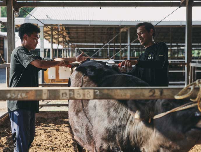 今まで印刷会社や土木業などいろいろな仕事を経験してきました。生きものに関わる仕事はここがはじめて。経験は6年ほどになります。はじめはアルバイトで入りましたが、中途半端に続けられる仕事ではないとすぐに気がついて、正社員になりました。私は小さい頃から生きものに囲まれた暮らしをしていて、牛の腹の上で寝ているような子供時代でした。だから、この仕事が向いているんでしょうね。役割としては主に餌やりを担っています。牛さんにはそれぞれ個性があり、状態も違います。だから餌やりも一律でやるというわけにはいかない。牛さんが今どんな状態なのか、様子を見ながら1頭ごとに餌のやり方を変えています。チーム全体で情報を共有して、相談をしながら内容を決めています。仕事をがんばった結果は肉質のランクとして表れる。苦労も多いですが、いい結果が出たときはチームみんなで喜んでいます。