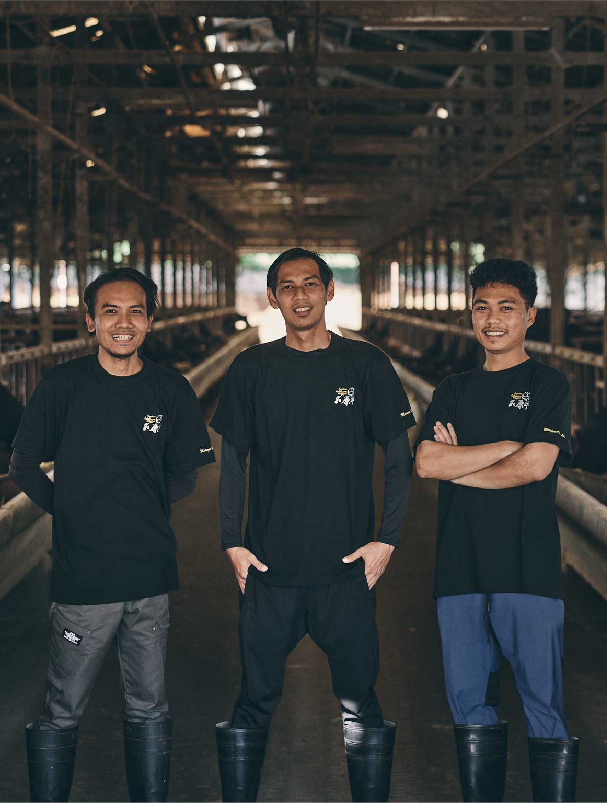 農家出身等で牛の仕事に興味があり、石原牛を希望して働いてくれているインドネシアの特定技能実習生(5年)です。3人とも意欲が高く、非常によくがんばってくれています。宗教に関わるお祈りの時間や断食等については尊重し、作業に支障のないように行ってもらっています。